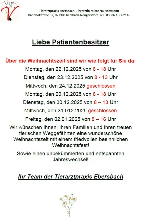 Sollten Sie uns bei einem dringenden Notfall nicht erreichen, wenden Sie sich bitte an den regionalen tierärztlichen Bereitschaftsdienst oder die nächste Tierklinik.